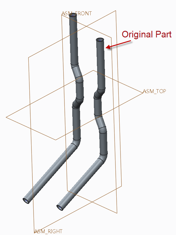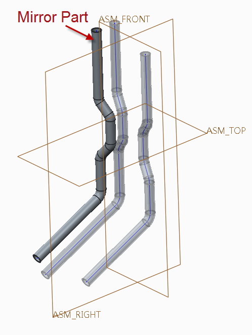 本組件中欲將右側的管件,利用Right Datum 建立鏡像零件。