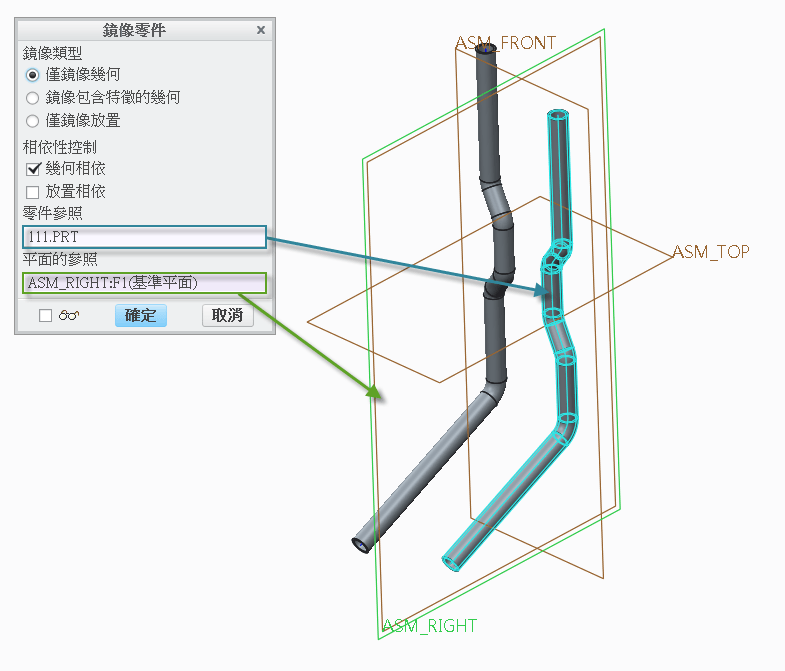 4.零件參照請選取預鏡射的原始零件,平面的參照請選取鏡射平面(本例為 : ASM_RIGHT)