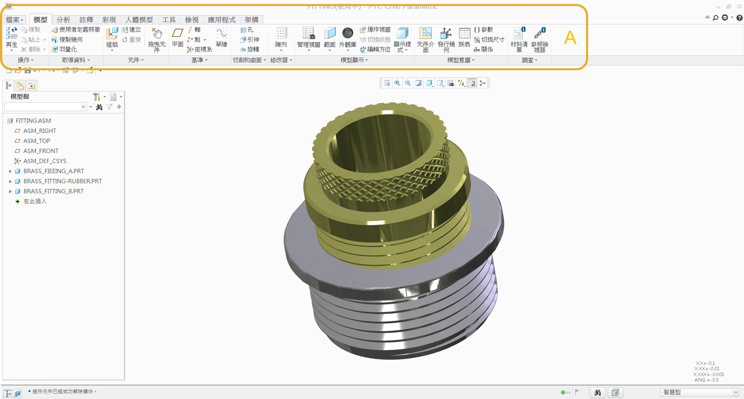 功能區在不同模式呈現內容會有不一樣的專屬功能,例如 零件(prt)、鈑金(prt)、組件(asm)、工程圖(drw)等等。