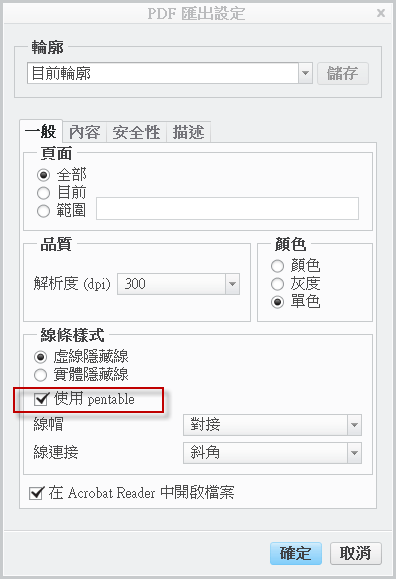 在設定PDF要使用pentable的參數,pdf_use_pentable 設為Yes