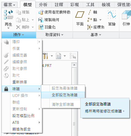 展開「唯讀特徵」,但無法修改特徵或參 照。可以查看特徵的尺寸,但無法編輯尺寸。