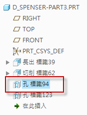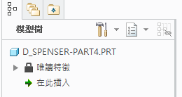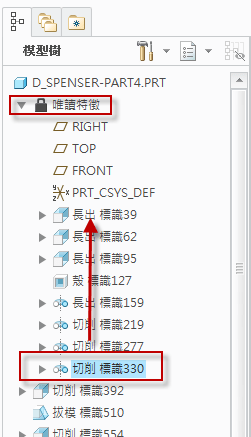 特徵會在模型樹中編 組到一起。「唯讀特徵」旁邊會顯示「鎖定」圖示 。