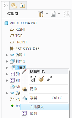 引伸1因為形狀的設變造成倒圓角遺失參照,此時可選取倒圓特徵右鍵>資訊>參照檢視器
