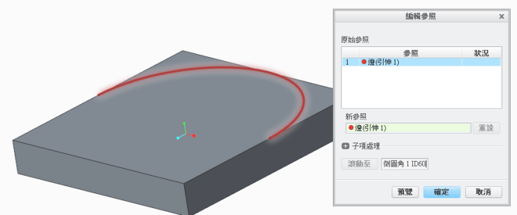 但如果要編輯遺失的參照,可用上一個介紹的編輯參照功能,在圓角特徵選到後編輯參照,