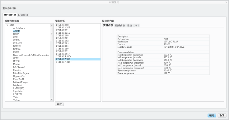 聚合物內容的參數如有需要修改後可為自訂材料。
