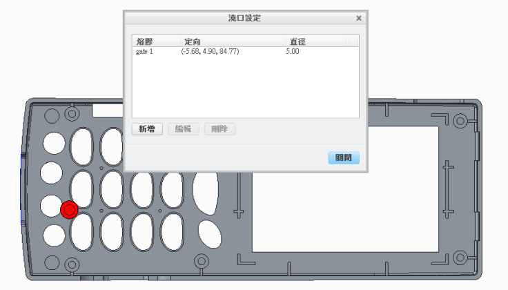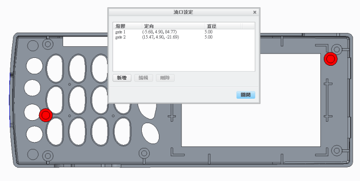 用同樣的方式再新增一個右上角澆口點,如下圖。完成後關閉澆口設定視窗。
