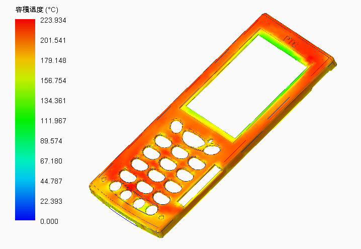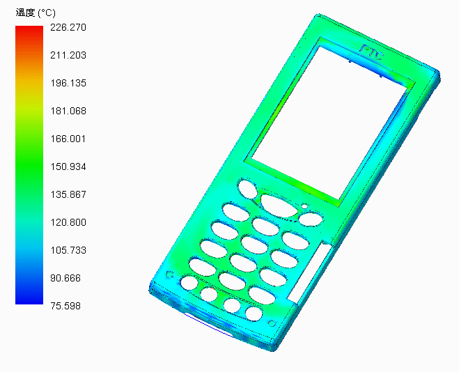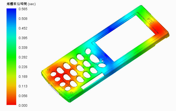 熔體前沿時間: 紅色澆口點到藍色所需時間。