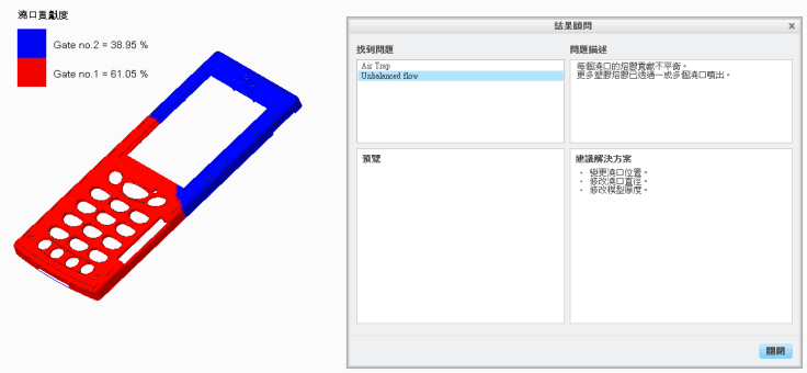 材料、澆口位置、射出機設定值、短射、包封、流痕、結合線位置、縮水痕等等諸多考量問題。