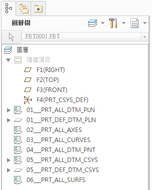 此篇以圖層樹為例,可以將基準平面、基準點、基準座標系、曲面或曲線等等元素,