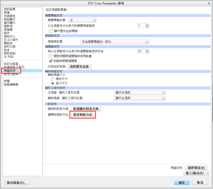 此時可以到 檔案 > 選項 > 視窗設定中把圖標板方位重設一下。