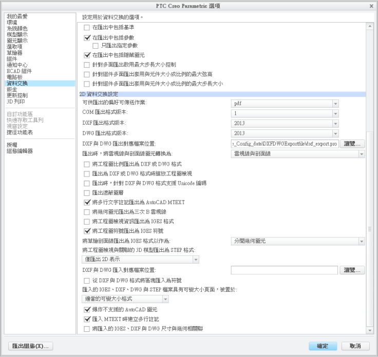 透過資料交換中的 2D 資料交換設定 DXF 與 DWG 匯出對應檔案位置做關聯設定。
