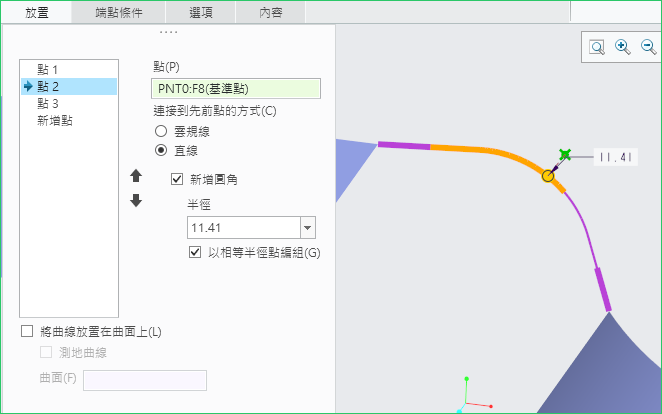 直線的型態中又可以另外設定是否每個點位要R角值,可分別定義或是以相等半徑點編組來達到單一R角值控制多個半徑。