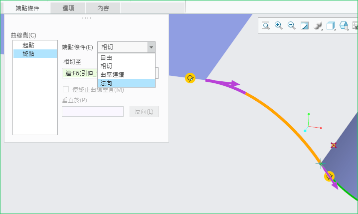 定義兩端點的相切條件有自由、相切G1、曲率連續G2及法向來定義對手連接的設定。可經由面板上的端點條件來進行設置,或是從圖形中點位上右鍵壓住進行選取,例如相切條件後,再選取要與哪條邊進行相切,最後方向的選擇,有時候預設會反向,需要自己手動反向切換一下。