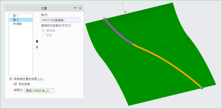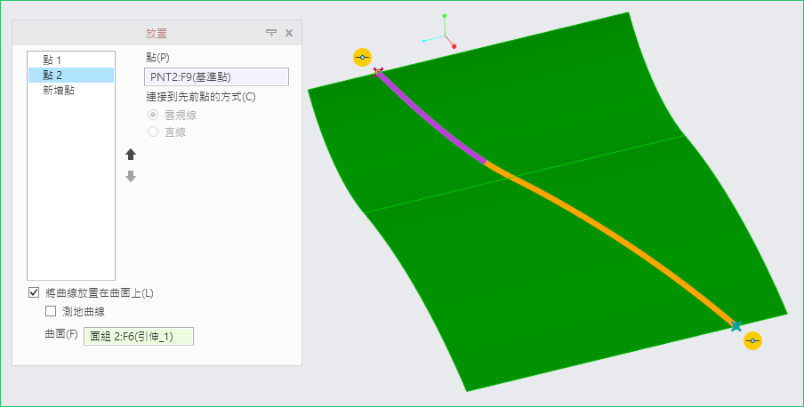 在曲面邊上可以先設置基準點,點選兩個基準點後勾選將曲線放置在曲面上,選取曲面要有技巧,右鍵循環方式選中你要的全部曲面,如果是分開的建議先選好要的曲面後複製貼上,他會是一整塊曲面可以選取。