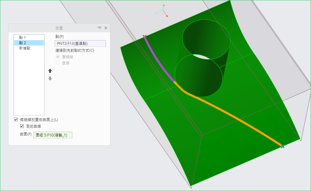 測地曲線沒記錯的話應該是Creo 8.0之後的版本,勾選後會自動找最短路徑的曲線放置在曲面上,上下圖有些許的不同。另外還可以繞過障礙位置找最短路徑。