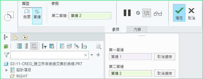 可利用相交的功能將兩個草繪的曲線建立一個交集曲線。