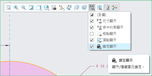 在關閉預設的狀態時如果您有鎖定幾何圖元,當下只有滑鼠游標在該圖元上才會顯示鎖定的符號,開啟後才會直接顯示在圖元上。