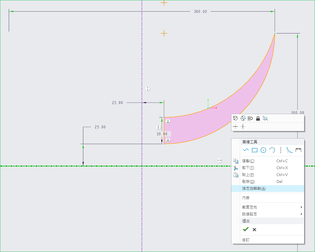必須包含一個草繪中心線做為旋轉中心軸,通常是第一條中心線為預設旋轉軸,也可以透過選取其他中心軸做為旋轉中心,這種方式視為內部的旋轉中心。