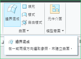使用兩個方向的曲線建立邊界混成,必須是一個封閉的迴圈,第一方向與第二方向至少各兩條曲線或以上。曲線長度可以大於封閉的迴圈,會自動把迴圈內的建立曲面。