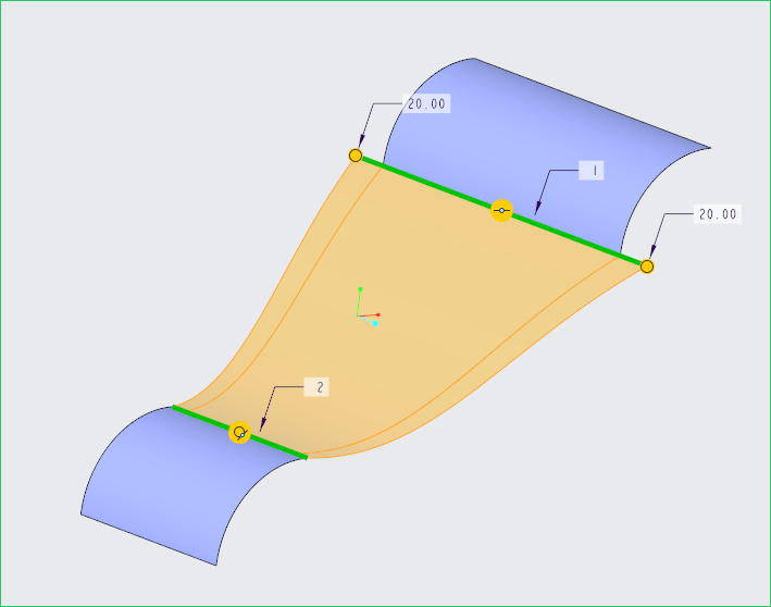 單一方向的混成曲面,鄰邊條件為相切或曲率連續時,預設側邊為自由狀態,可依各個的邊設為新增側曲線影響為相切狀態。