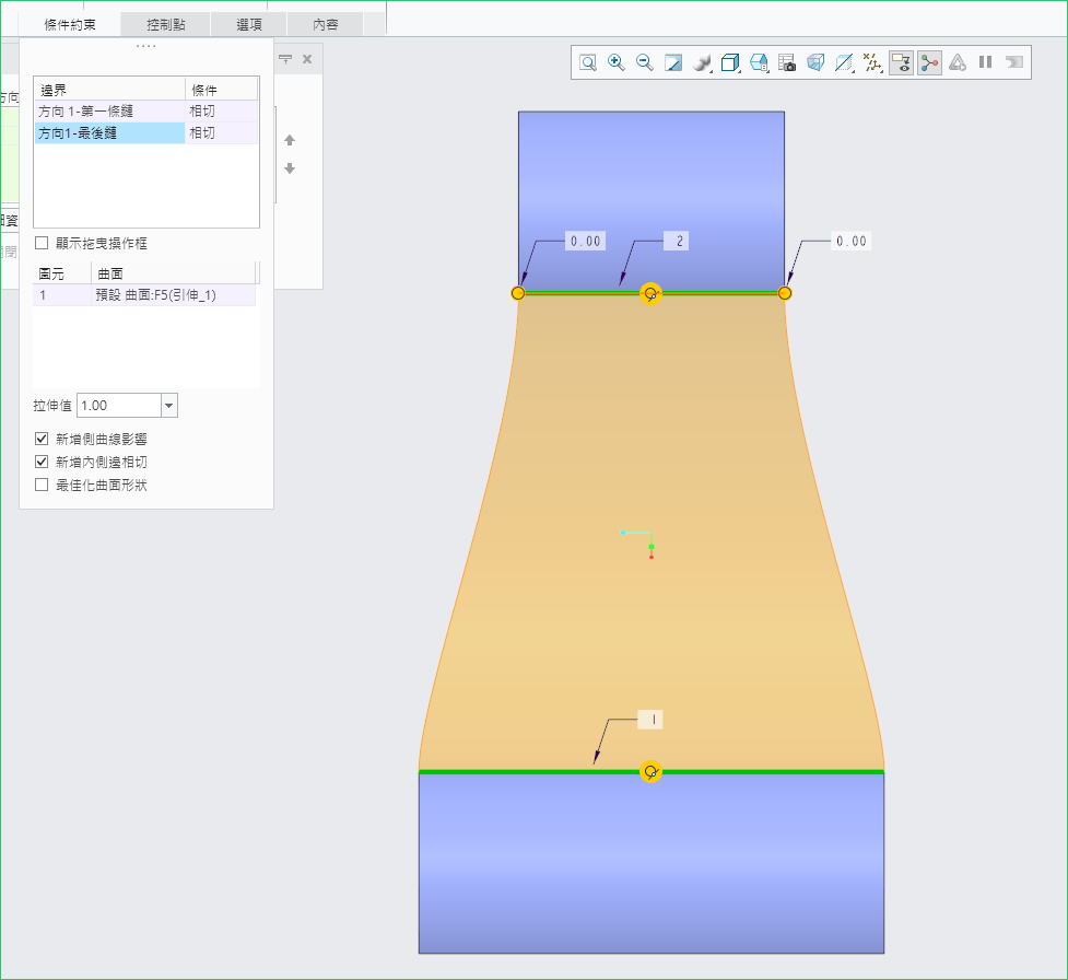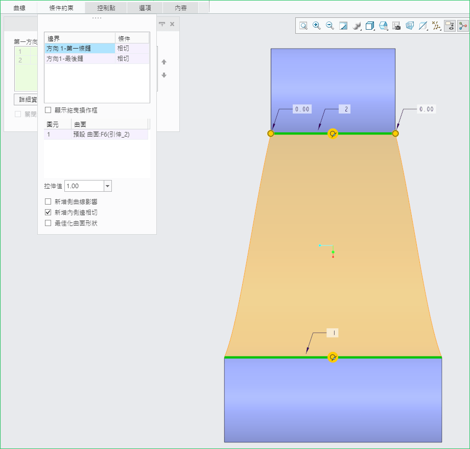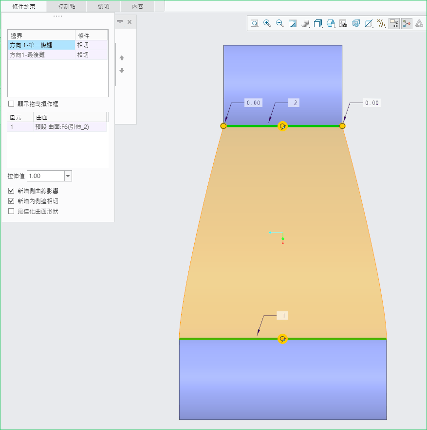條件約束面板上勾選顯示拖曳操作框,可針對相切或曲率連續條件控制邊界拉伸係數來影響曲面形狀。
