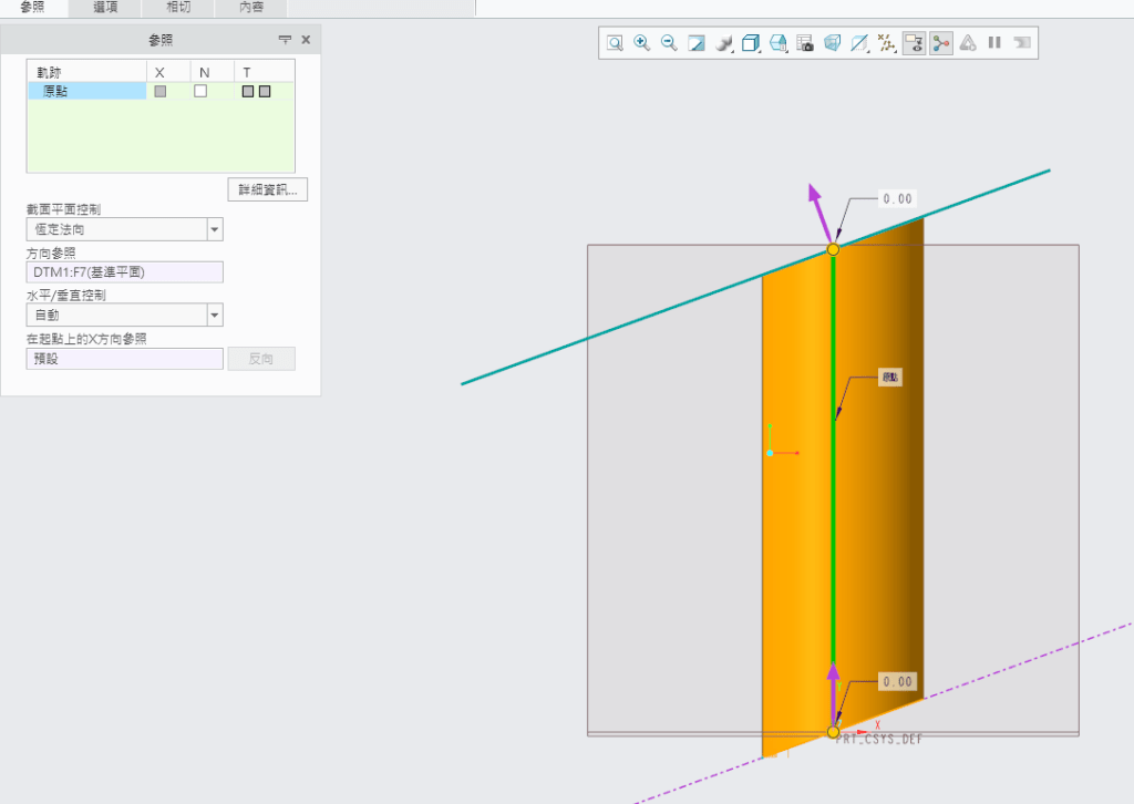 草繪截面方向原始預設為法向於軌跡,但有需要時可以自選草繪的方向條件。