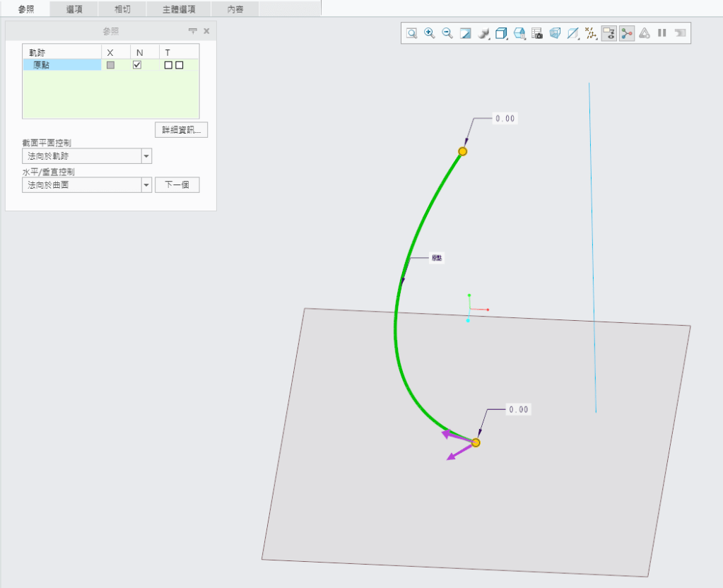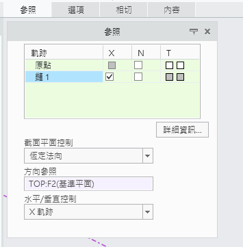 草繪截面平面X向會穿過指定的X軌跡並隨著選取的曲線鏈扭轉。