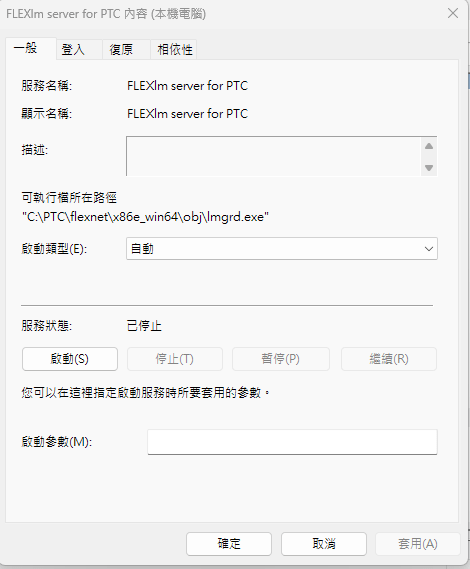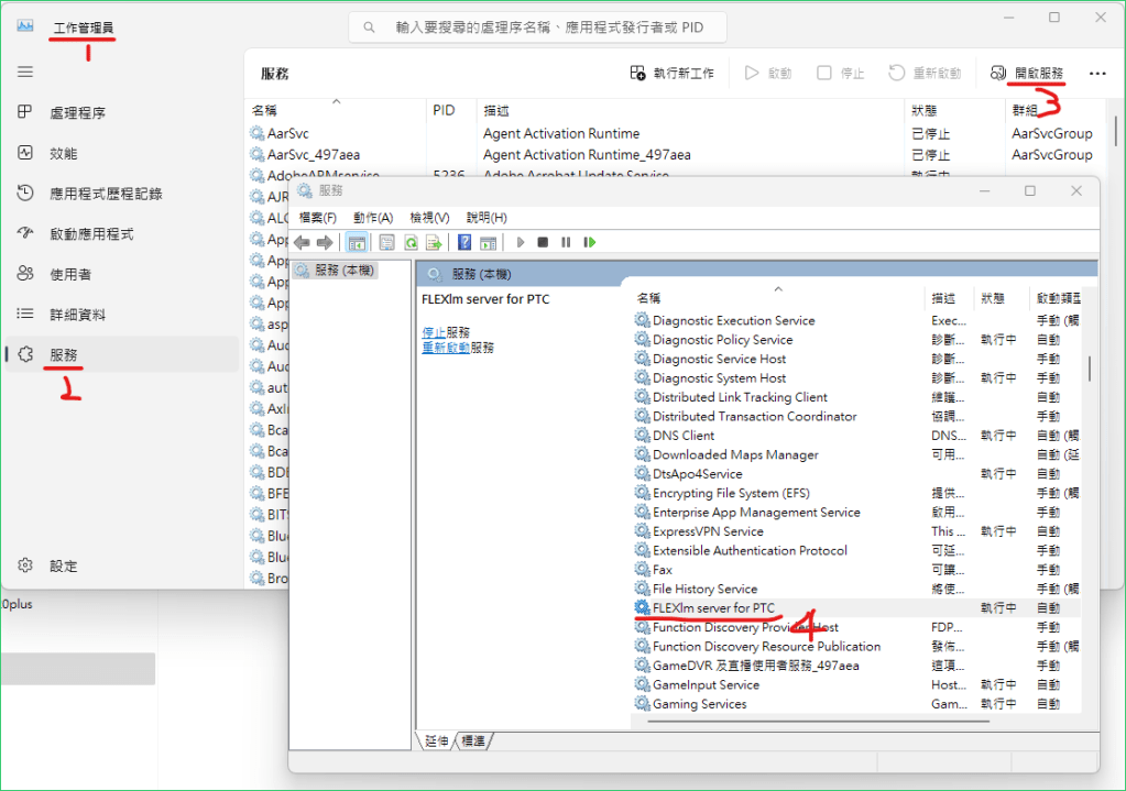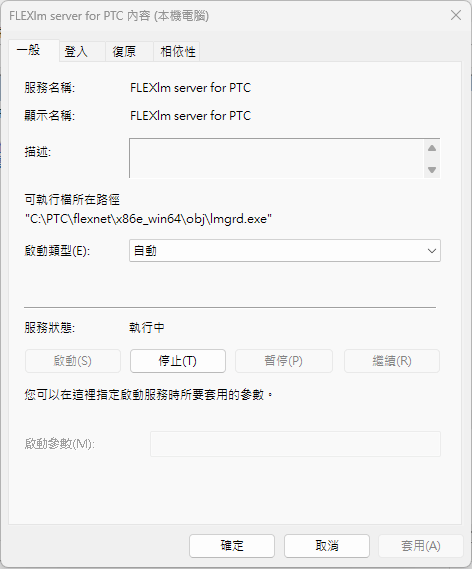 工作管理員 > 服務 > 開啟服務 > FLEXlm server for PTC