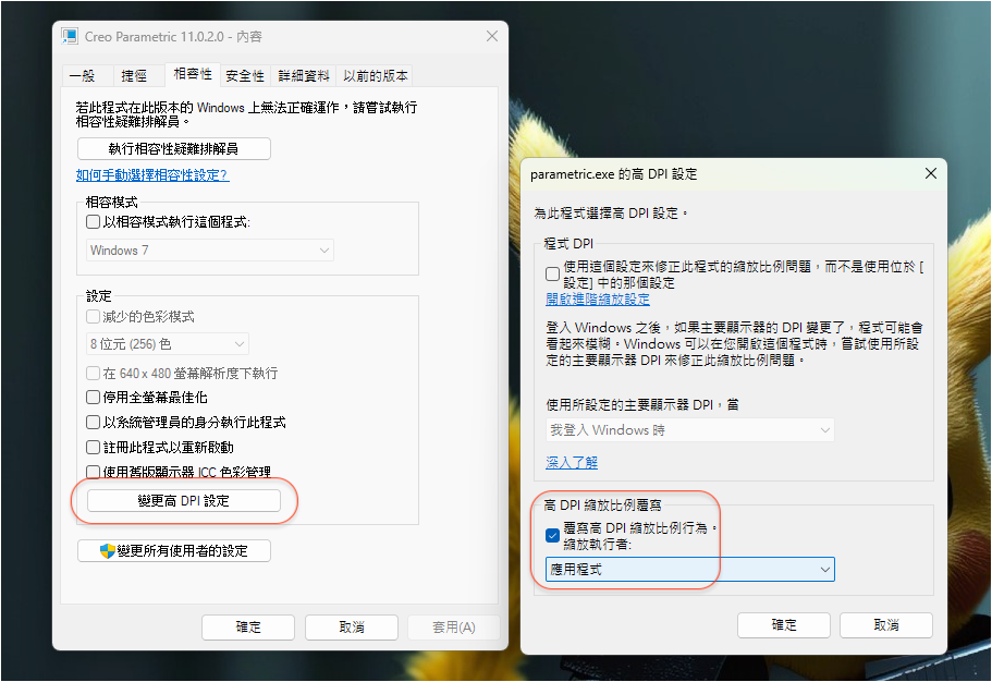 Creo 圖示右鍵 》內容 〉相容性 》變更高 DPI 設定 〉勾選覆寫 DPI 縮放比例行為。